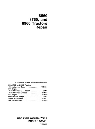 John Deere 8560, 8760, 8960 Tractors Repair Technical Manual