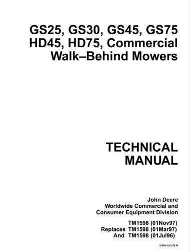 John Deere GS25, GS30, GS45, GS75, HD45, HD75 Commercial Walk-Behind Mowers Technical Manual