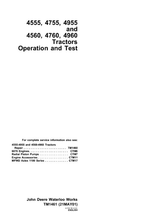 John Deere 4555, 4755, 4955, 4560, 4760, 4960 Tractors Operation and Test Technical Manual