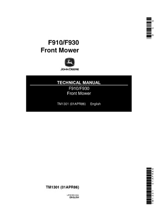 Technical Manual John Deere F910, F930 Front Mower.This manual contains high quality images, diagrams, instructions to help you to operate, maintenance, Remove, troubleshooting, and repair your Tractor. Language: English Format: PDF,412 pages File size:32 MB…