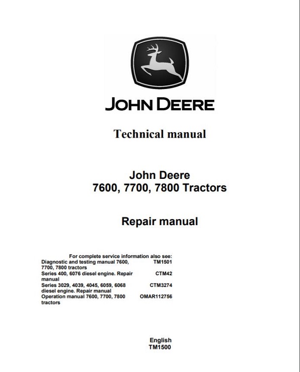 Technical Manual John Deere 7600 7700 7800.This manual contains high quality images, diagrams, instructions to help you to operate, maintenance, Remove, troubleshooting, and repair your Tractors. Language: English Format: PDF,910 pages File size:54.4 MB Compatible…