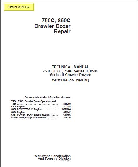 Technical Manual John Deere 750C 850C Dozer Repair.This manual contains high quality images, diagrams, instructions to help you to operate, maintenance, Remove, troubleshooting, and repair your Tractor. Language: English Format: PDF,776 pages File size:21 MB…