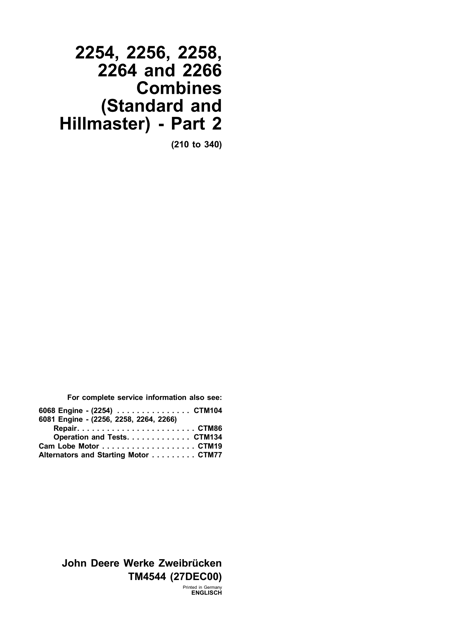 Technical Manual John Deere 2254, 2256, 2258, 2264, 2266 Combines.This manual contains high quality images, diagrams, instructions to help you to operate, maintenance, Remove, troubleshooting, and repair your Combines. Language: English Format: PDF,3000+ pages File…