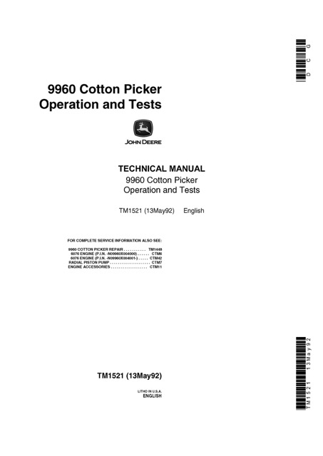 Technical Manual John Deere 9960 Cotton Picker Operation and Tests.This manual contains high quality images, diagrams, instructions to help you to operate, maintenance, Remove, troubleshooting, and repair your Cotton Picker. TM1521 Manual Sample Preview Language:…