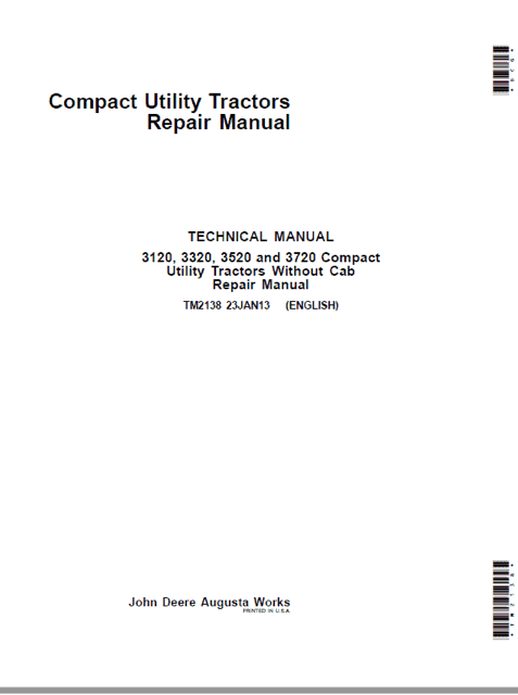 Repair Manual John Deere 3120, 3320, 3520, 3720 Compact Utility Tractors.This manual contains high quality images, diagrams, instructions to help you to operate, maintenance, Remove, troubleshooting, and repair your Tractors. TM2138 Manual Sample Preview Language:…