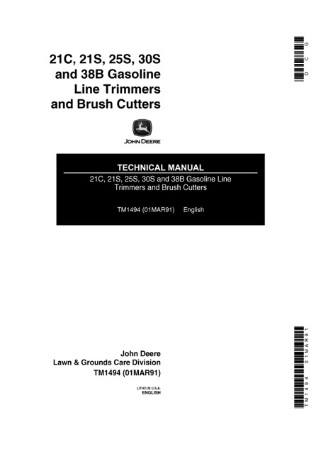 John Deere 21C, 21S, 25S, 30S, 38B Gasoline Line Trimmers, Brush Cutters Technical Manual