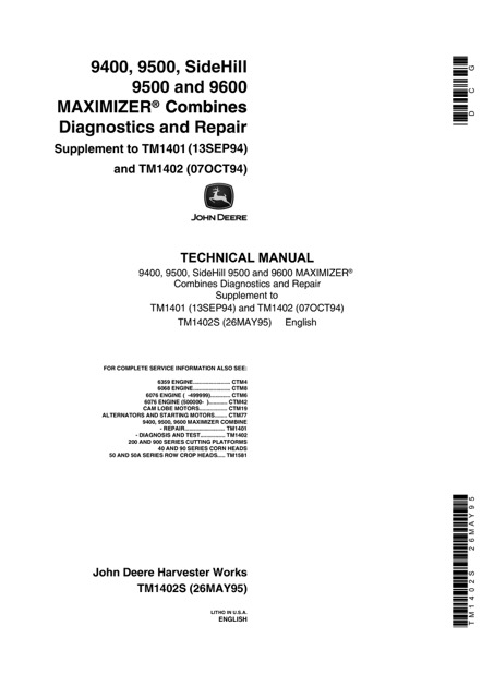 Technical Manual John Deere 9400, 9500, SideHill 9500 & 9600 MAXIMIZER Combines Diagnostics.This manual contains high quality images, diagrams, instructions to help you to operate, maintenance, Remove, troubleshooting, and repair your Combines. TM1402S Manual Sample…