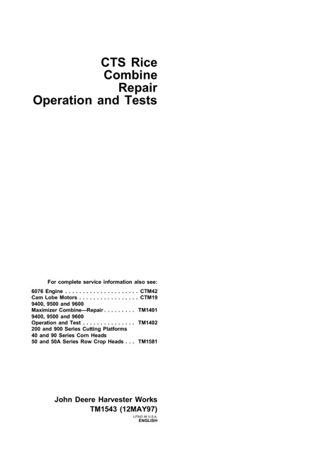 John Deere CTS Rice Combine Repair, Operation and Tests Technical Manual